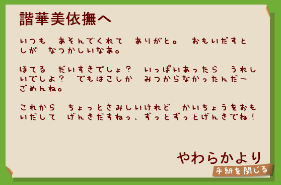 お手紙。若干日本語がアレだね。いいんだけど。日本語が出来るくらいにはちゃんと育ててあげたかったな・・・